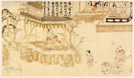 This final assembly of the scripture begins with the Buddha in a pavilion in a grove in India, surrounded by five hundred great bodhisattvas, five hundred lesser saints, and innumerable nature spirits.