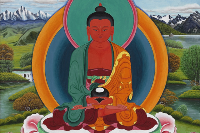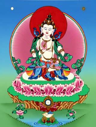 Now, my body, wealth, and the source of my virtue of all my lives I give without clinging to all sentient beings, who have all been my mother. May great waves of benefit be accomplished without obstacle for all sentient beings. Thus, these three lines illuminate the meaning that from beginningless lives until the present lifetime, although innumerable bodies have been taken, they have all only added to the causes and results of further suffering. Moreover, there has not been benefit, even of the size of a sesame seed. Therefore, now, in order to make this cherished precious body meaningful, one should imagine that inexhaustible clouds of offerings radiate from one’s body, upwardly presenting offerings to the exalted guests, who are the Three Jewels and the Protectors of Qualities. Generosity is presented as clouds of gifts to the lower guests of compassion, the sentient beings of the six realms and the guests who are owed unpaid karmic debts. Not only that, whatever is owned, including all of one’s possessions and wealth, as well as the root of all virtue accumulated throughout the three times, is given without clinging to all kind parent sentient beings who have been my mother.