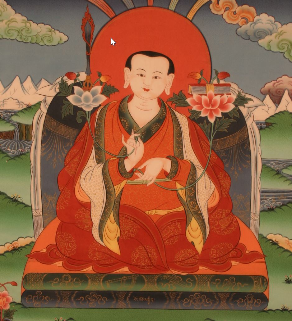 We Tibetans have one crown ornament and two earrings. The crown ornament is Padmasambhava, and the two precious earrings are Milarepa and Rongzom Chenpo Chökyi Zangpo.