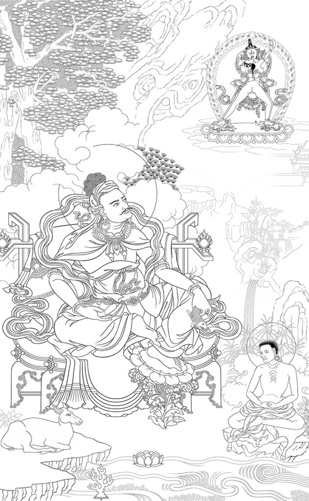 Following his realization, Tilopa wanders about, bringing others onto the path and instructing them in the Vajrayana way. He becomes renowned as a powerful and unpredictable master, who in the service of the dharma, like other siddhas, often performs actions considered shocking or scandalous in a conventional setting. He spends much of his time in cremation grounds, practicing and teaching, as is common for the other siddhas. When debating with non-Buddhists, he often makes his points by means of miracles rather than discursive argument. Although Tilopa had several human teachers, his role as progenitor of the Kagyu¨ lineage stems from his having met the celestial buddha Vajradhara face-to-face and received teachings directly from him. Tilopa’s lineage includes teachings on mahamudra received directly from Vajradhara; practices of inner yoga that make up the ‘‘six yogas of Naropa’’; and anuttara-yoga tantra transmissions including father, mother, and nondual tantras.
