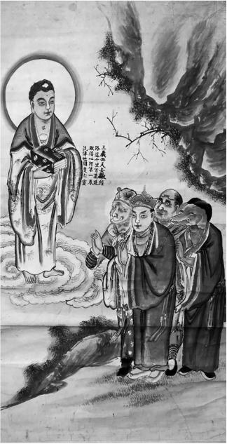 Paintings such as the one here are hung above the alter during these readings and often found on the front-piece of sūtras found in Japan.